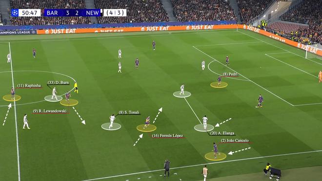 佩德里回撤,迫使拉姆齐提上防守;坎塞洛的前插,则牵制安东尼-埃兰加回撤,让赫拉德-马丁获得从容持球的机会。洛佩斯向马丁方向跑动,忌惮中路直塞的托纳利只能紧随其后;莱万多夫斯基则牵制丹-伯恩跟防,拉菲尼亚填补莱万留下的空位。