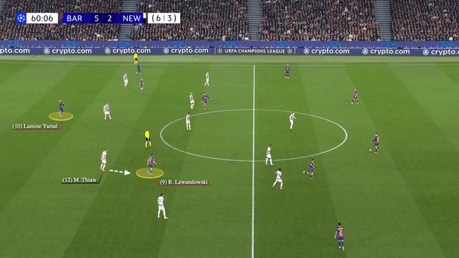 巴萨的第六粒进球,更是将纽卡防线搅得混乱不堪。马丁观察进攻选择时,莱万再度深度回撤,这次蒂奥切换防守目标盯防波兰前锋;处于越位位置的亚马尔举手要球,吸引了伯恩的注意力。